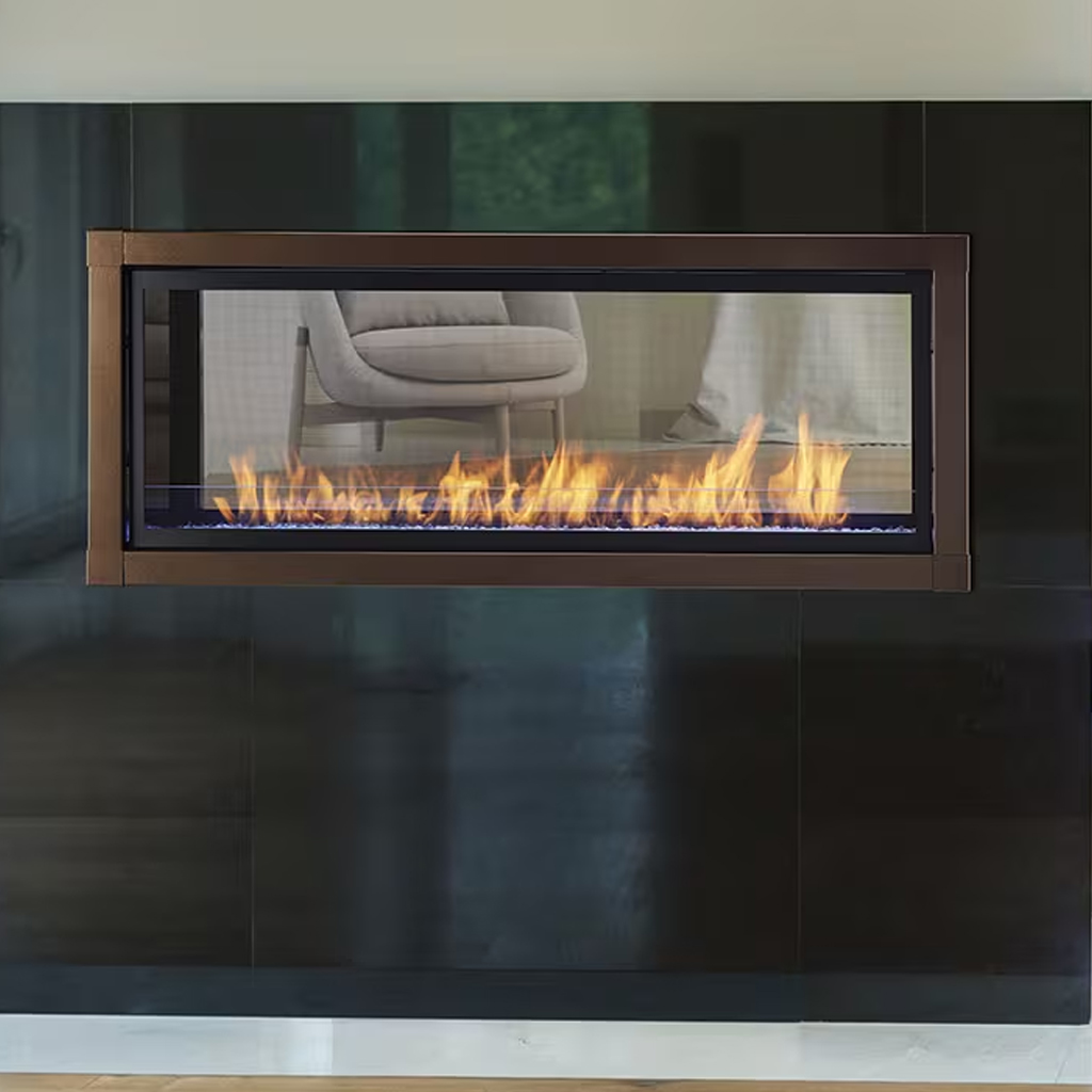 A modern, vent-free see-through gas fireplace that warms two spaces at once. Clean lines, striking flames, and elegant lighting pair with up to 99.9% efficiency, finished with black reflective glass and multi-colored LED hearth lighting.